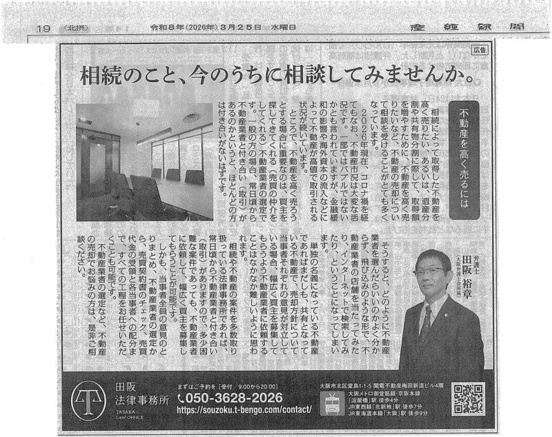 産経新聞の大阪市内版(2026年3月20日)、北河内版(2026年3月24日)、北摂版(2026年3月25日)に